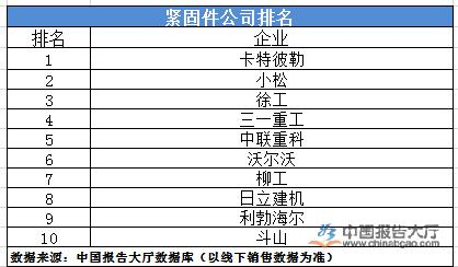 中国报告大厅网讯,据紧固件公司排名统计分析,紧固件公司排名分别是卡特彼勒、小松、徐工、三一重工、中联重科、沃尔沃、柳工、日立建机、利勃海尔、斗山。以下是紧固件公司排名详细名单。