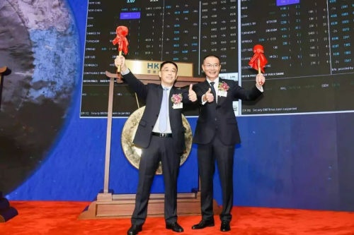 蓝光控股集团董事局主席、蓝光发展董事长杨铿与蓝光嘉宝服务董事长姚敏鸣锣港交所