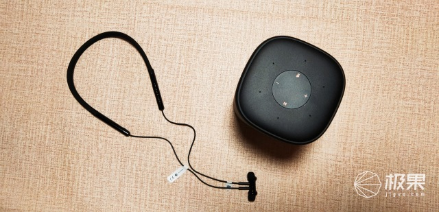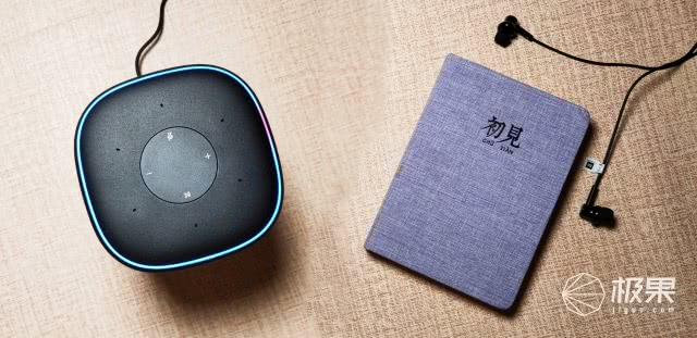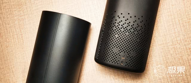 从上方来看圆形的功能键是音箱上唯一的一枚按键,上面集中了播放/暂停、音量加、减和麦克风的开/禁,这一部分如果能做成触摸式能更加提升使用体验,周围开外的6枚暗孔或许是全方位的红外遥控,而最周圈的一环指示灯带为工作指示所用,也是小爱音箱系列产品的延续设计。