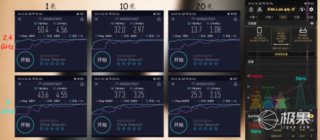 网速测定环节,将2.4GHz和5GHz分开测试,在距离路由器1米、隔着一堵墙的10米和隔着好几堵墙的20米三个位置处分别多次测试:最高速度能够达到家里网络平日的顶值50MB/s,结果也符合2.4GHz穿墙更好,5GHz 速率更高的结论;路由器覆盖范围能够应付100平米左右的家庭空间,新路由也没有什么长时间的断连、网速峰谷值异常、罢工等情况。这样的网速测定容易受到干扰,仅能测试出大概范围内的值做以参考罢了,也没必要太过较真。