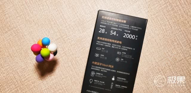 背面写满的文字又展示了这款音箱的三个功能卖点:支持语音控制小米IoT平台的2000余款智能设备、支持语音控制5000余个品牌的传统家电、内置的蓝牙Mesh网关可以让家里更多的蓝牙设备接入互联网。
