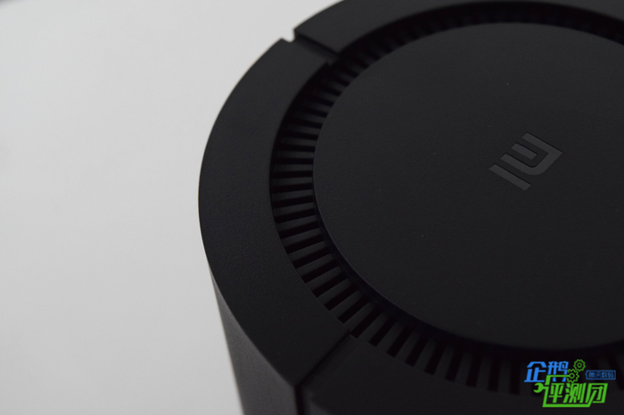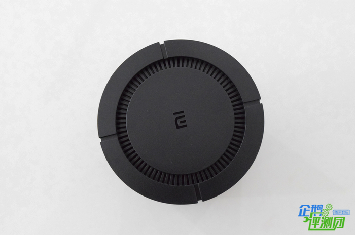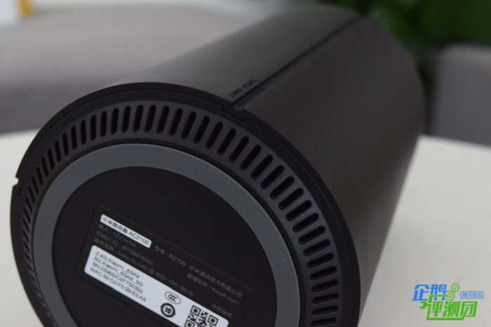 看完正面,我们再来看看设备的顶部和底部设计,毕竟这样的圆柱体设计顶部和底部都是最为重要的地方。小米路由器AC2100机身顶部配有一圈环形散热孔,中间区域则印有小米的logo;底部也有一圈散热孔,设备型号等标识被贴在底部中间区域,从这样的设计不难看出小米为了降温也是下了大功夫的。