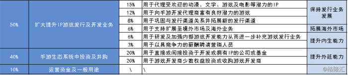 其中可以简单进行分类:35%以促进发行业务的持续发展;6%以推动扩展海外市场;9%以提升自研及运营等内生能力;40%用以外延扩张。