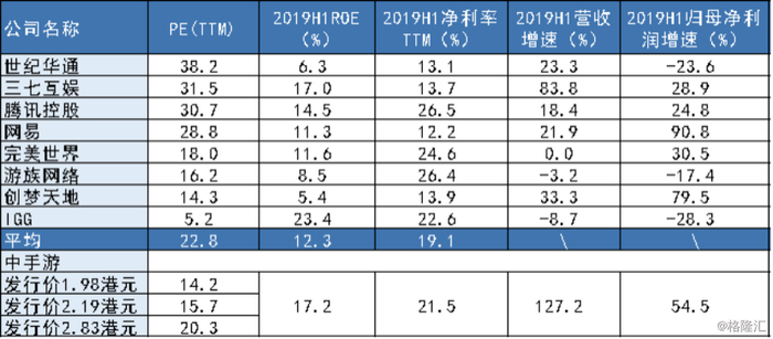 但从公司盈利能力方面可以看到,中手游2019年中期ROE为17.2%,远超过大部分同行,而2019年中期净利润TTM指标达到21.5%,同样也超过行业平均。而成长性方面,中手游表现十分突出,127.2%的营收增速,以及54.5的归母净利润增速都是业务拔尖。