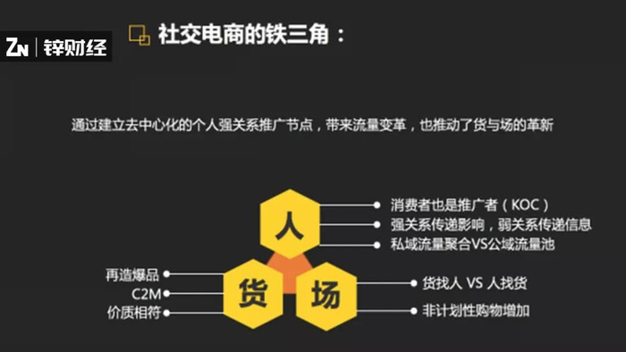 传统电商有一个消费铁三角,社交电商也有,不过社交电商更多是人的生意,通过建立去中心化的个人强关系,改变流量,改变货与场。