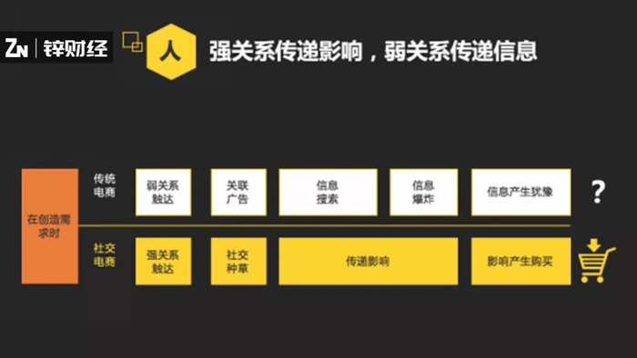在社交电商的铁三角里,我们看到与传统电商最大的差别在于:
