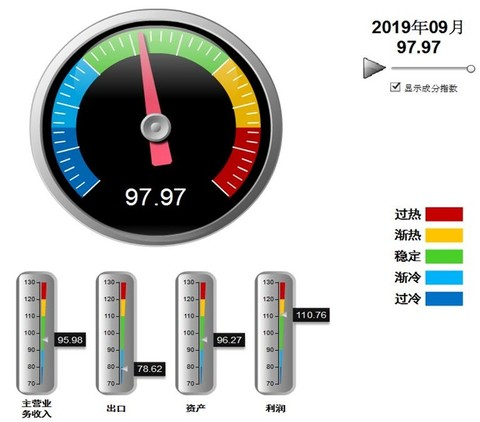据中国轻工业经济运行及预测预警系统数据显示,2019年9月乳制品行业景气指数97.97,处在“渐冷”区间,较8月下降2.29点。四项分项指数环比均有下降,出口景气指数下降幅度较大,其中:营业收入景气指数95.98,位于“稳定”区间,较8月下降0.42点;出口景气指数为78.62,位于“过冷”区间,较8月下降19.26点;资产景气指数为96.27,位于“稳定”区间,较8月下降0.68点;利润景气指数110.76,位于“渐热”区间,较8月下降2.53点。