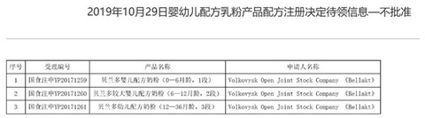 10月29日,国家药品监督管理局政务服务门户公布了3款不批准的婴幼儿配方乳粉申请信息,申请人为Volkovysk Open Joint Stock Company 《Bellakt》。具体信息如下: