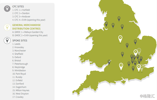 作为服务于英国民众的生活电商网站,Ocado在全英共建有3个仓库(另有一个在建中),17个配送中转站。