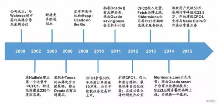 公司发展初期主要以配送农产品为主,为此,公司自主研发的冷链物流技术和智能仓储配送系统构成了Ocado的核心竞争力。