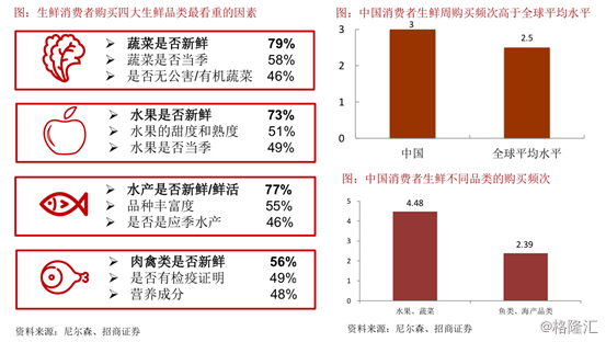 中国消费者通过增加生鲜购买频次的方式来保证生鲜的新鲜度,每周平均购买频次达3次,高于全球平均水平2.5次,其中蔬果类更是高达4.48次。
