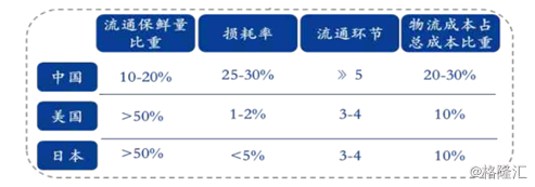 据《中国物流统计年鉴》,国内生鲜流通保鲜量占总量比重仅10%,相比美日约低40pct;损耗率 约 25-30%,高于美日20%以上;流通环节一般在5个之上,高于美日;生鲜物流成本占总成本比例高于发达国家10%。