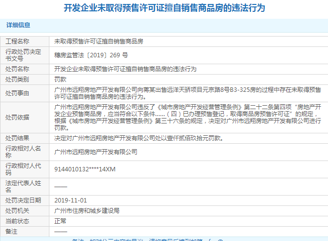 中国网财经11月11日讯 广州市住房和城乡建设局近期发布的行政处罚消息显示,广州市远翔房地产开发有限公司向蒋某出售远洋天骄项目元京路8号B3-325房的过程中,存在未取得预售许可证擅自销售商品房的违法行为。广州市住房和城乡建设局决定对广州市远翔房地产开发有限公司处以1290元罚款。