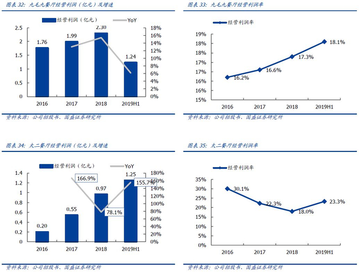 由于九毛九餐厅发展较早,运营已经成熟,近年来九毛九餐厅经营利润率稳步提升。19H1,公司九毛九餐厅的经营利润为1.24亿元,同比+6.2%。九毛九餐厅经营利润率19H1达18.1%,较2016年的16.2%提高了1.9pct。而太二餐厅受高速扩张的影响,餐厅经营利润率有所波动,19H1餐厅整体的经营利润率为23.3%,较2018年高5.3pct,较2016年低6.8pct。(注:经营利润非国际财务报告准则口径,大致等于餐厅层面的营业利润)