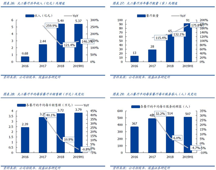 19H1太二营收5.37亿元,同比+146%。收入增长主要由餐厅数量增加驱动,截止19H1太二共有餐厅91间,同比+176%;餐厅日均销售额3.79万元,同比小幅下滑0.8%,主要受门店高速扩张的影响(19H1太二同店餐厅日均销售额同比+10.4%)。餐厅日均服务顾客507人,同比-4.7%;而顾客人均消费75元,同比+4.2%。