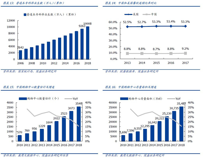 近年来购物中心主导的新消费形态快速增长,越来越多的消费者前往具备一体化消费功能的购物中心消费。根据我们的测算,从2010年到2018年,全国的购物中心数量由570家增长至3549家,CAGR达26%,且未来仍将以每年约500家的速度快速增加。购物中心的快速增长为快时尚餐饮提供了充足的生长土壤,快时尚餐饮市场规模有望随购物中心的增长快速提升。
