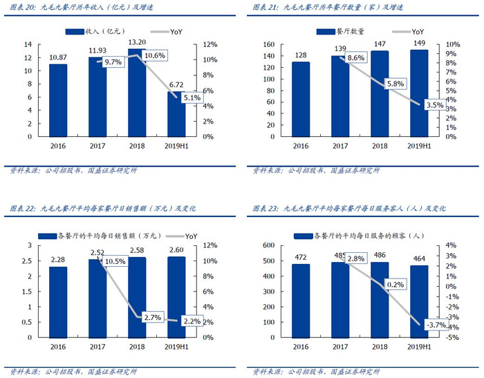 19H1九毛九餐厅共实现营收6.72亿元,同比+5.1%。收入增长由餐厅数量增加和日均消费额增长驱动,截止19H1,九毛九共有餐厅149家,同比+3.5%;19H1餐厅日均销售额2.60万元,同比+2.2%。日均销售额又可以拆分为餐厅日均服务顾客量和顾客人均消费,19H1九毛九平均每家餐厅日均服务顾客464人,同比-3.7%;顾客人均消费56元,同比+5.7%。