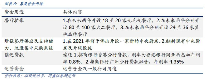 其中,餐厅扩张包括在未来两年开设18至20家九毛九餐厅、80至100家太二餐厅和24至36家其他品牌餐厅。餐厅供应系统的改进为在2021年前于佛山开设一家新的中央厨房,同时翻新现有中央厨房及升级设施。此外,公司还计划偿还招商银行香港分行贷款(利率为香港银行同业拆息加年利率0.8%)和招商银行广州分行贷款融资(年利率4.35%)。