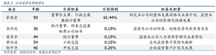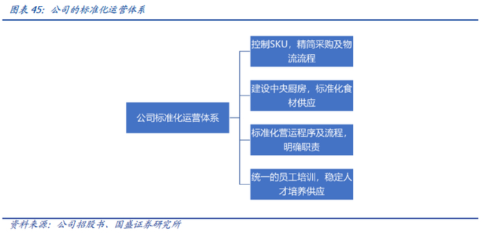 公司目前已经建立起适应扩张的标准化运营体系,包括精简物流采购、标准化食材供应、标准化运营流程及稳定的人才培养制度,解决了餐饮企业扩张中的主要难题。此外,公司充分授权各品牌负责人,分享15%~25%不等的股权以激发其积极性。同时,公司在总部设立相关的品牌创造及后台支持部门,为前线品牌拓展提供全方面的支持。
