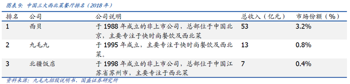 2018年公司旗下品牌“太二”的收入为5.4亿元,市场份额达4.4%,且仍在快速增长中。西北菜市场,公司目前落后于西贝位居第二,2018年其主力品牌“九毛九”收入13亿元,在西北快时尚餐饮市场的市占率为0.8%。