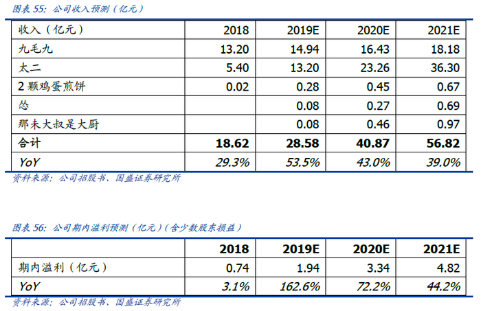 我们预测2019/20/21年公司收入分别为28.58/40.87/56.82亿元,同比+51.1%/+43.0%/+39.1%;期内溢利2.04/3.34/4.82亿元,同比+176.6%/+63.5%/+44.2%。收入增长主要由太二驱动,预计太二餐厅数量全年将由2018年的65家增长至2021年底的297家,同比+357%。受益新店成熟影响,公司利润率水平有望逐步提升,我们预测2019/20/21年公司期内溢利率分别为6.8%/8.2%/8.5%。