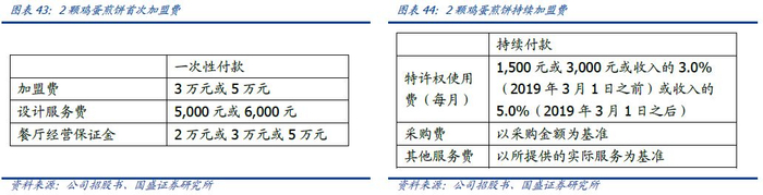 公司旗下正餐品牌九毛九、太二、怂和及那未大叔是大厨餐厅均以自营模式独家经营。自营模式有利于提升餐厅的经营效率、安全性及盈利能力,同时能够对向顾客提供的食物及服务质量维持足够的控制权。同时,公司在管理相对简单的小吃板块2颗鸡蛋煎饼开放了加盟模式,公司对加盟商收取3.5万~5.6万不等的首次加盟费和月收入3.0%~5.0%的持续加盟费。
