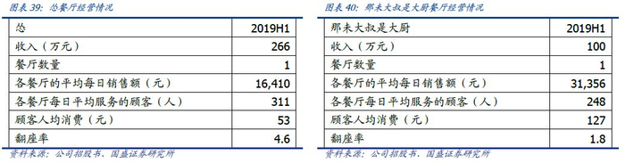怂餐厅相对大众,价格更加亲民、翻座率更高,目前日均销售额为1.64万元(年化为599万元),日均客流为311人,人均消费53元,翻座率为4.6。而那未大叔是大厨相对高端,日均销售额3.14万元(年化1144万元),日均客流为248人,人均消费127元,翻座率为1.8。预计随着新品牌的完善和成熟,餐厅日均销售额还有进一步提升的空间。