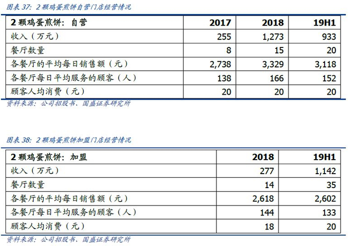 2颗鸡蛋煎饼自营店19H1总收入933万元,同比+67.7%,门店数达20家;而公司在2018年下半年开放加盟,截止19H1加盟门店数已达35家,加盟店总收入达1142万元。在餐厅的日均销售额上,直营店高于加盟店,平均每日销售额为3118元,每日平均服务152位顾客;而加盟店的日均收入为2602元,日均顾客位133人。