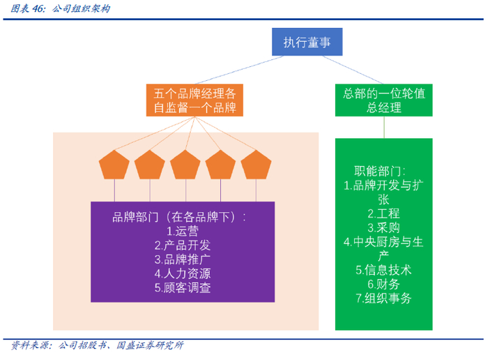 各品牌部门下分别各自设立运营、产品开发、品牌推广、人力资源和顾客调查,各品牌的负责人及团队为自己的品牌发展负责。总部职能部门负责新品牌开发与扩张,同时为已有品牌提供工程、采购、中央厨房及生产、信息技术、财务及组织事务。在此组织构架下,总部拥有不断开拓新品牌的能力,同时可为新品牌提供全方位的后台支持,让品牌的创作成为标准化流程。同时,新品牌授权品牌负责人组织团队独立运营,最大化单品牌的灵活性和主观能动性。