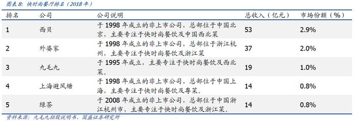 2018年公司收入19亿元,市场份额占比约1.0%。排在公司前面的是西贝和外婆家,分别专注于西北菜和浙江菜,在2018年在快时尚餐饮市场的占有率分别为2.9%和2.0%。