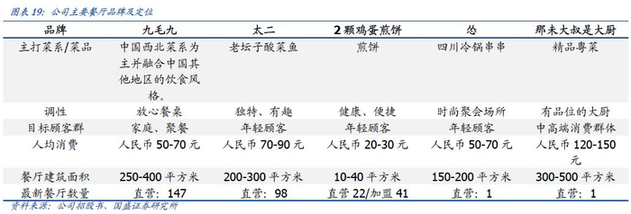 其中九毛九是公司最早经营的西北菜品牌,目前门店数量已经达到147家,且全部以直营形式经营,人均消费在50-70元。太二主营老坛酸菜鱼,以年轻人为目标客群,直营门店数达98家。2颗鸡蛋煎饼主营轻食煎饼,目前有22家直营门店和41家加盟店。怂和那未大叔是大厨是公司于2019年新推出的餐饮品牌,分别以四川冷锅串串和精品粤菜为主打,目前都只有1家门店。