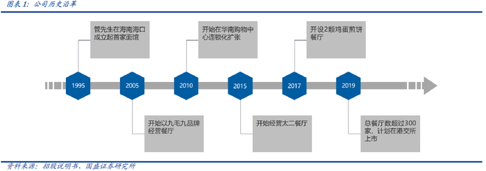 公司的历史可以追溯到1995年,创始人管先生在海南海口开设其首家面馆。2005年,管先生正式以“九毛九”品牌经营餐厅。2010年,公司开始在华南地区的购物中心开设分店,开始连锁扩张。随后公司餐厅网络开始快速扩张,至2015年,其餐厅已经扩展至北京、深圳、天津、武汉及南京。2015年,公司开始经营“太二”品牌餐厅,并取得了重大成功。2017年创立2颗鸡蛋煎饼餐厅。2019年,公司餐厅总数超过300家,并于8月28日向港交所递交招股书,拟在香港主板上市。