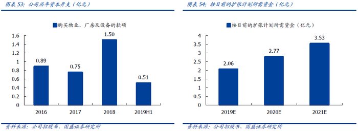 公司2016/17/18/19H1在固定资产上的资本开支分别为0.89/0.75/1.50/0.51亿元。根据公司目标的扩张计划,2019/20/21年公司开拓新门店所需的资金分别为2.06/2.77/3.53亿元。按目前公司的经营现金流情况,账面现金能覆盖扩张所需的资金需求。