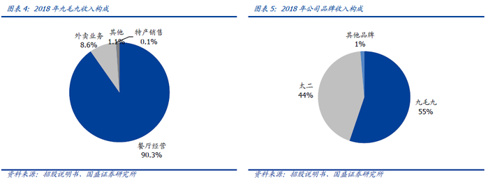 收入以餐厅经营为主,九毛九和太二是主要收入来源。收入构成中,按业务划分,餐厅经营/外卖业务/特产销售/其他业务分别占90.3%/8.6%/0.1%/1.1%;按品牌划分,九毛九/太二/其他品牌占比分别为55%/44%/1%。