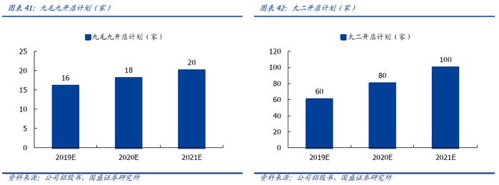 其中九毛九计划在2021年前开设54家新店,其中一线城市占比59%,每家新店投资额在250万元左右;太二计划在2021年前开设240家新店,其中一线城市占比40%,每家门店投资额亦在250万左右。此外,公司还计划开设47家2颗鸡蛋煎饼自营店、17家怂餐厅和12家那未大叔是大厨餐厅,单店投资额分别为15万元、200万元和500万元。