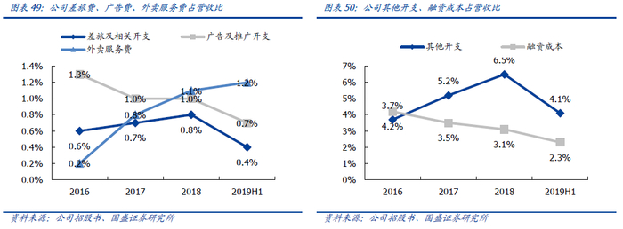 。19H1九毛九餐厅共实现营收6.72亿元(+5.1%),截止19H1门店数149家,较年初增加2家。在没有大量新店开张的影响下,九毛九餐厅层面经营利润率不断提升,由2016年的16.2%提升至18.1%。而太二餐厅扩张在加速,19H1营收5.37亿元(同比+146%),截止19H1门店数91家,较年初增加26家。根据公司的计划,预计到2021年前将分别新开54家九毛九和240家太二餐厅。此外,公司还计划开设47家2颗鸡蛋煎饼自营店、17家怂餐厅和12家“那未大叔是大厨”餐厅(怂和那未大叔是大厨是公司19H1新推出的品牌)。