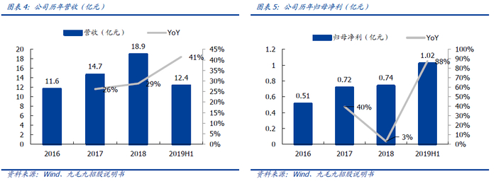 公司收入规模稳步增长,利润逐年提升。2017/18/19H1公司营收分别为14.7/18.9/12.4亿元,同比+26%/+29%/+41%,2016-2018年CAGR为27.5%;归母净利分别为0.72/ 0.74/1.02亿元,同比+40%/+3%/+88%,2016-2018年CAGR为20.0%。