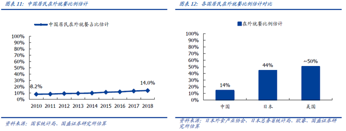 随着居民收入的提高,中国居民在外就餐的次数正逐步提升;根据我们的匡算,2010年中国居民的在外就餐比例为8.2%,到2018年则提升到了14.0%,CAGR达7%。但是与发达国家相比,我国居民的在外用餐比例仍处于非常低的水平。2018年日本居民的外食率在44%左右,美国人的在外就餐比例约为50%。相较发达国家接近半成的在外就餐比例,我国居民的外餐占比还有很大提升空间。