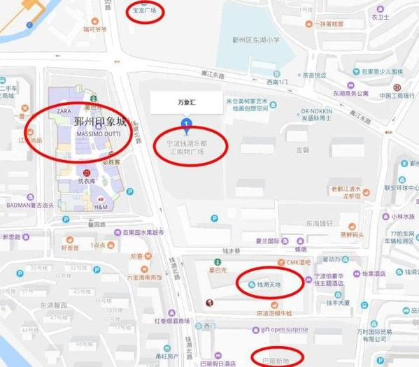《联商网》此前在宁波考察后发现,钱湖北路和嵩江东路这个交叉口竞争十分激烈,东北方是将于今年12月22日开业的宝龙广场、西南方是已经成熟运营了7年的鄞州印象城、东南方就是万象汇,百米内还有钱湖天地、巴丽新地。