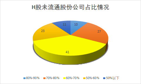 在这161家H股中,合计149家公司的非流通占比超过50%,这意味这在所有的H股中,几乎全部的上市公司的股权结构为非流通股为主。其中占比超过80%的有12家,占比在70%-80%之间的有27家,占比在60%-70%之间的高达41家,占比50-60%的有23家,而占比不足50%只有的11家,非流通股份占比最小的为富贵鸟的9%。