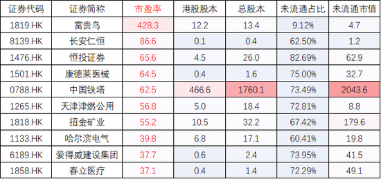 其中,非流通市值最高的为邮储银行的3163亿港元,其次为中国电信和中国铁塔超2000亿市值的未流通股。该三家企业的非流通股本分别占75.5%、82.85%和72.49%,占比明显较高。