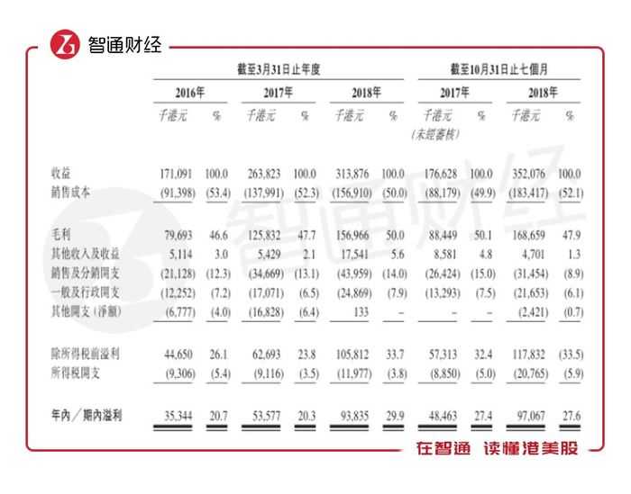 公司在2016-2018财年及2017、2018年10月止的七个月,羚邦集团录得总收入分别为1.71亿元、2.64亿元、3.14亿和1.77亿元、3.52亿元;录得毛利7969.3万元、1.26亿元、1.57亿元和8844.9万元、1.69亿元,对应毛利率分别为46.6%、47.7%、50%和50.1%、47.9%。最终实现净利润3534.4万元、5357.7万元、9383.5万元和4846.3万元、9706.7万元,对应净利率分别为20.7%、20.3%、29.9%和27.4%、27.6%,无论营收、毛利还是净利润均呈现稳健增长态势。