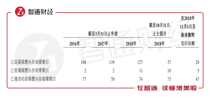 业绩增长的同时,公司版权续约率过低引发市场普遍质疑。智通财经APP了解到,公司截止2016、2017及2018财年末到期版权的数目分别为108个、139个和127个,但续约数量仅分别为2个、2个和11个,公司截止2018年10月末的七个月及2018年11月起自招股说明书最新日期,公司届满媒体37个、28个对应10个、5个的重续,其比例依旧非常低。