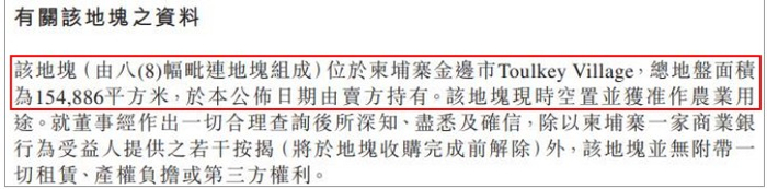 根据其模糊的披露,公司在“柬埔寨金边市Toulkey村”预付购买了154,886平方米的农业用地。
