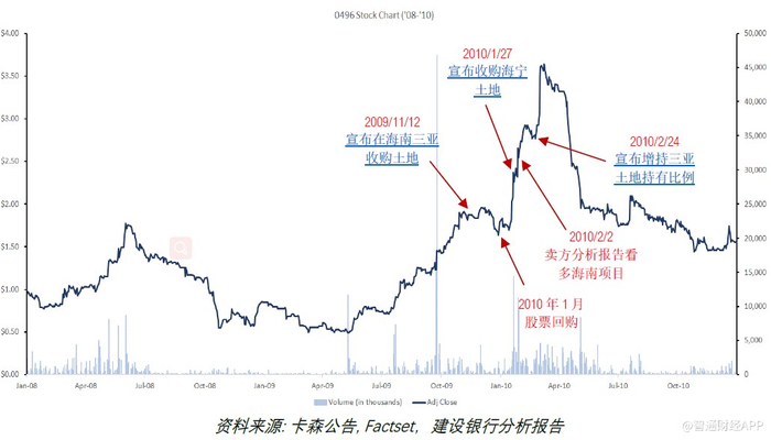 2010年2月,卡森增持了海南土地的所有权,公司股价一度跃升至历史新高。但该项目毫无进展,卡森股价也可想而知地回落。