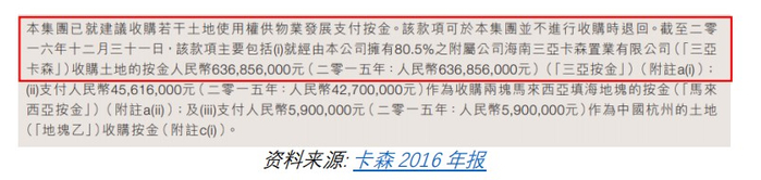然而,卡森不但没有冲销该投资,还为三亚这块地“支付更多款项”。2017年,卡森宣称有81,646平方米土地获得政府批准,并称其向地方政府进一步支付了4,950万元人民币以取得一小块早应归属公司的土地权证。