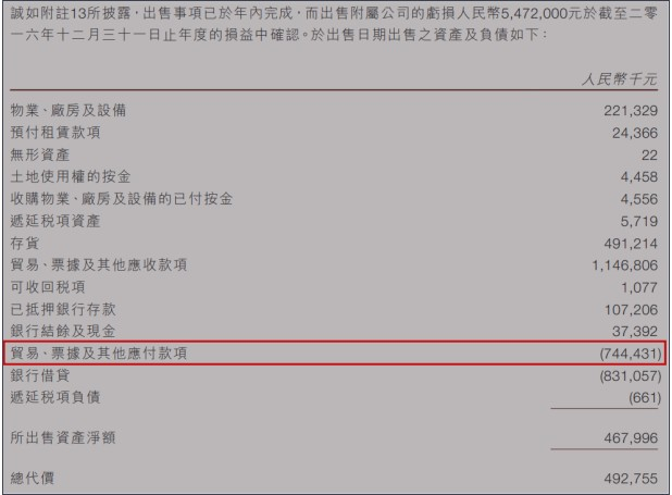 还有证据表明,卡森将所售业务的债务留给了上市公司。根据卡森的披露,皮革业务在被出售时应有7.44亿元人民币的贸易、票据和其他应付款项。这项金额占比重大,达到卡森前一年披露的该项目余额的55%。