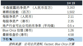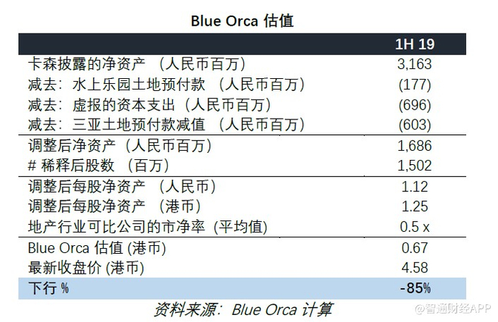 Blue Orca称,如今,卡森唯一实质的业务是地产开发,但这也将随着剩余住宅单元的售罄而岌岌可危。由于其他业务部门都处于亏损中,对卡森最乐观的估值方法是参照其他可比的香港上市地产公司的平均市净率(0.5 倍)。在将该机构认为不存在的项目及资产剔除出卡森的净资产后,其对卡森的估值在 0.67 港元,下行空间 85%,但这也还是保守估计。