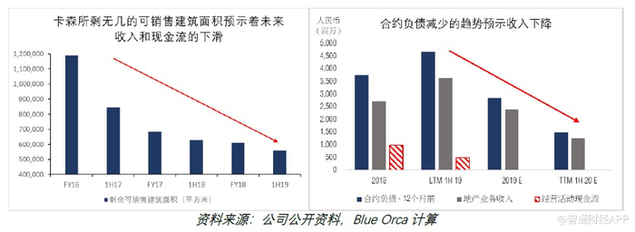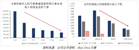 卡森自2014年以来就没有扩充其地产项目。而截至2019年上半年,公司已出售了76%的住宅单元1。卡森可供销售建筑面积快速下滑,已跌至2014年最低点。这预示着未来地产业务的收入和现金流会持续萎缩。