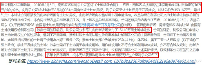例如,在2010年,海南利乐房地产开发有限公司(“利乐”) 与南新农场达成了一项购买协议,以3.53亿元人民币购买981亩(654,000平方米)的土地。同年,利乐预付了南新农场1.51亿元人民币。该土地包括国有划拨的农用土地,因此土地使用权转让以及更改土地用途的规定更严苛。利乐受让合同项下土地的目的是重新划拨为建设用地,但却无法获得当地政府批准。因此,五年过去了,利乐没有收到任何土地使用权,遂向南新农场提出诉讼索要还款。